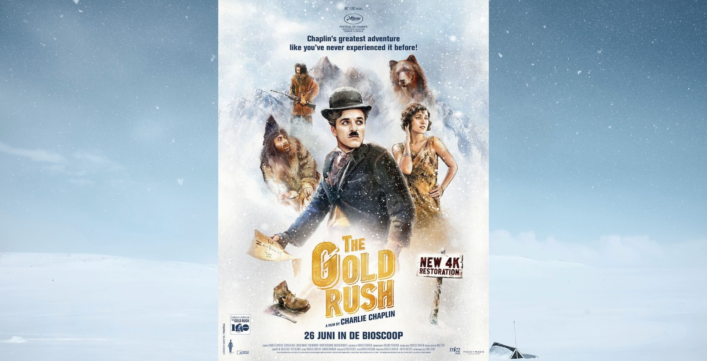 In ‘The Gold Rush’ reist een eenzame goudzoeker af naar Alaska op zoek naar goud. Temidden van barre sneeuwlandschappen, hongerige avonturiers en onverwachte romances weet Chaplin een onvergetelijke mix van humor, melancholie en menselijkheid te creëren. Van de beroemde broodjesdans tot de scène waarin een hut op het randje van een klif balanceert: de film zit vol scènes die filmgeschiedenis hebben gevormd.